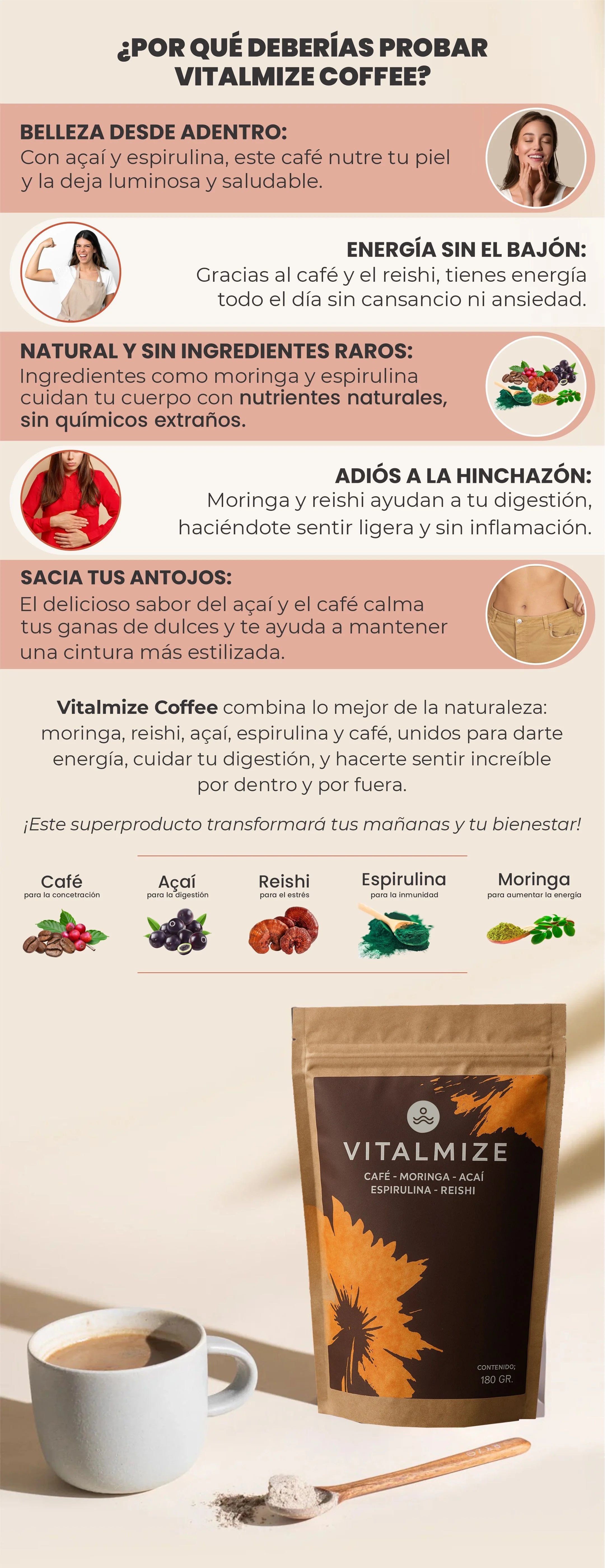 Nuestra mezcla de ingredientes naturales está enriquecida con cinco superalimentos adaptógenos: café, reishi, acai, moringa y espirulina. Estos alimentos ayudan a equilibrar tu intestino y te dan energía de manera constante durante todo el día. Son ricos en nutrientes que tu cuerpo necesita para sentirse bien y mantenerse activo. ¿El sabor? Tan delicioso como tu taza de café favorita.